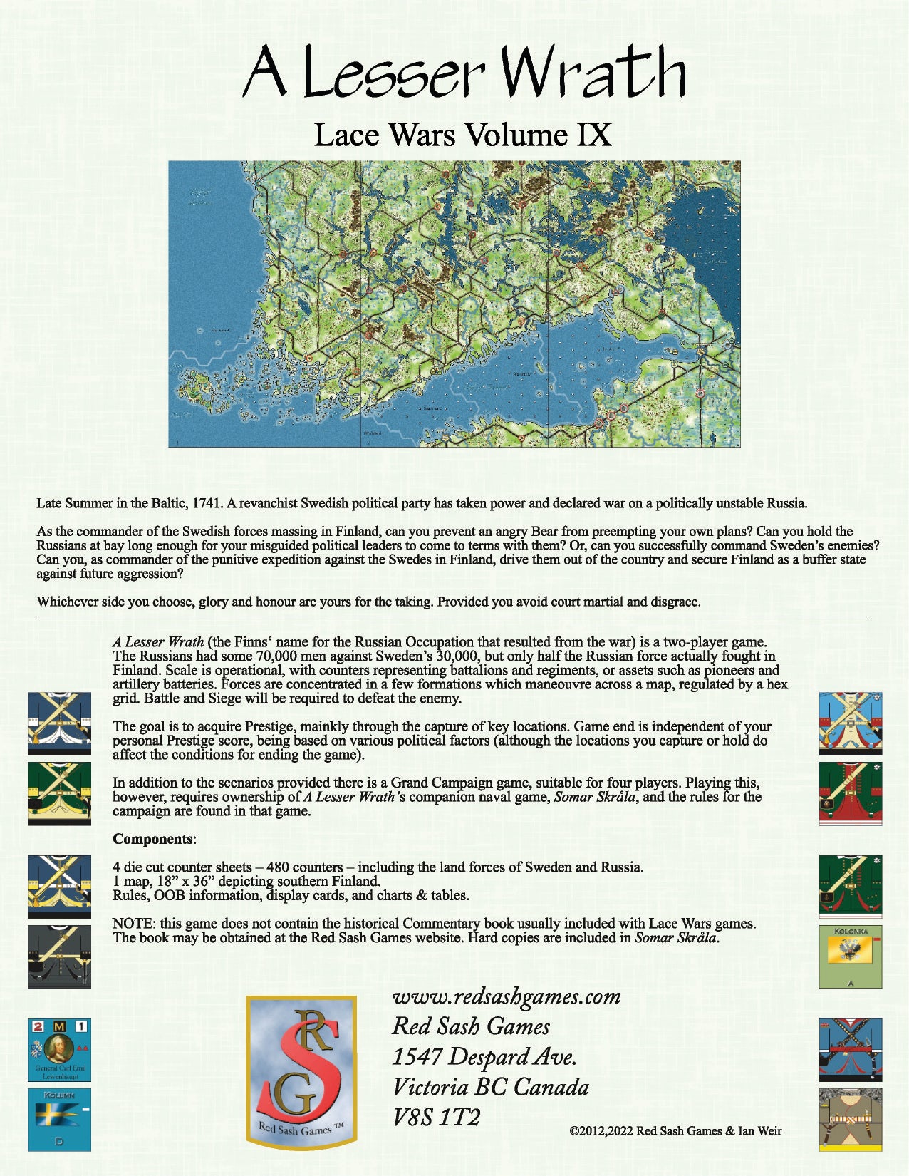 A Lesser Wrath is a 2-player 18th century tactical battle game. It covers the Russian-Swedish "War of the Hats" for 1741-1743. It is the ninth installment in the Lace Wars saga.