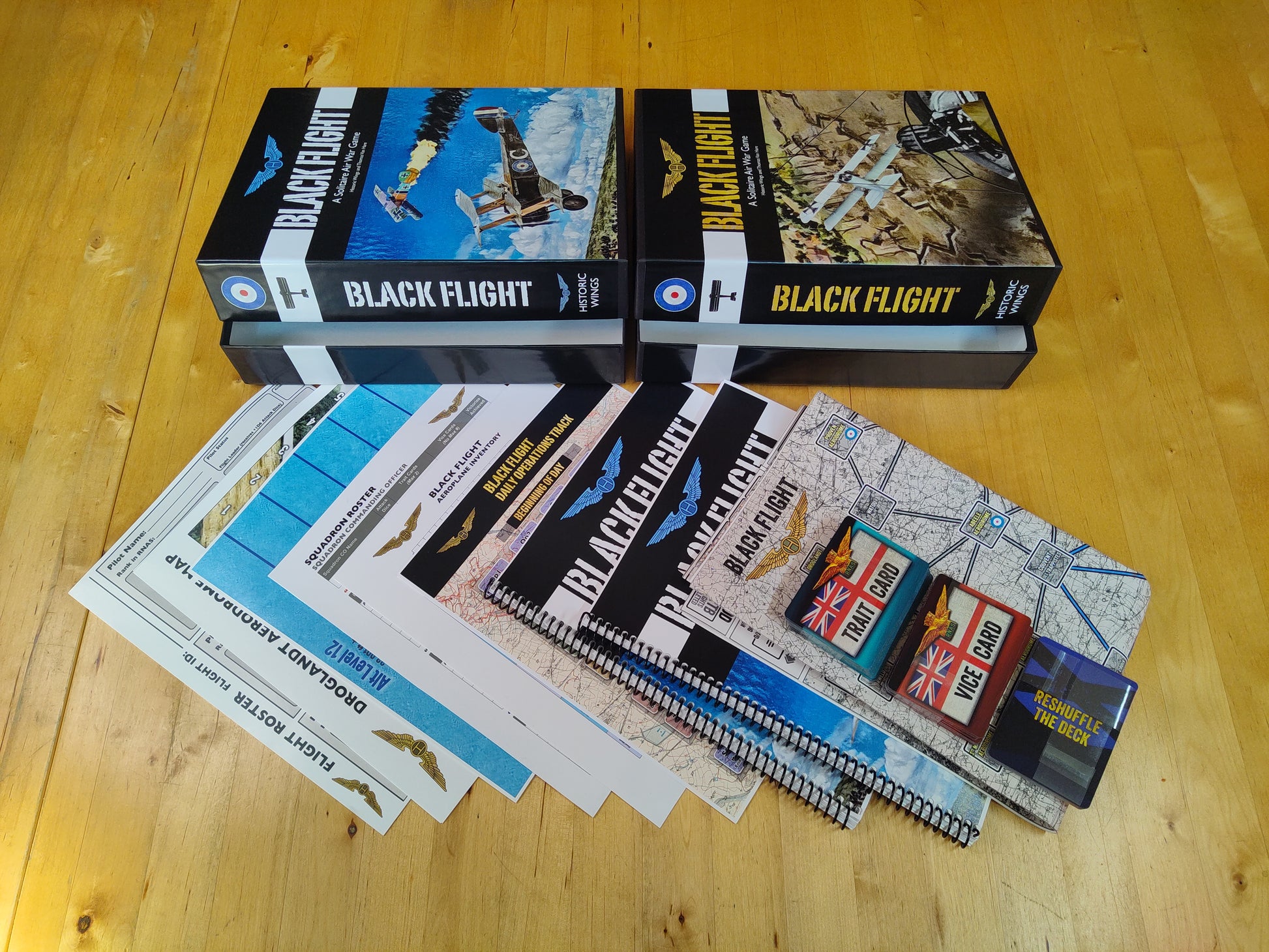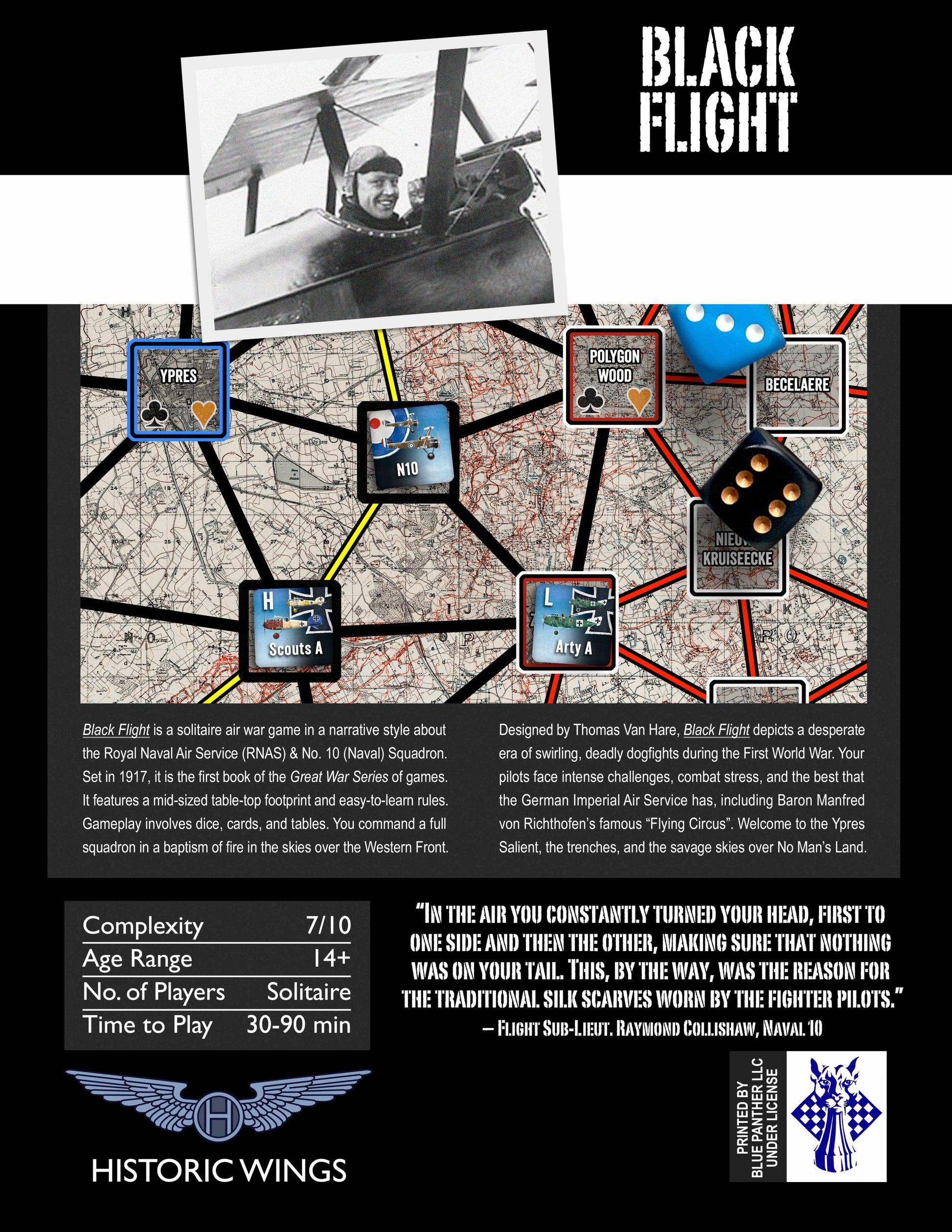 Designed by Thomas Van Hare, Black Flight depicts a desperate era of swirling, deadly dogfights during the First World War. Your pilots face intense challenges, combat stress, and the best that the German Imperial Air Service has, including Baron Manfred von Richthofen's famous "Flying Circus" Welcome to the Ypres Salient, the trenches, and the savage skies over No Man's Land.