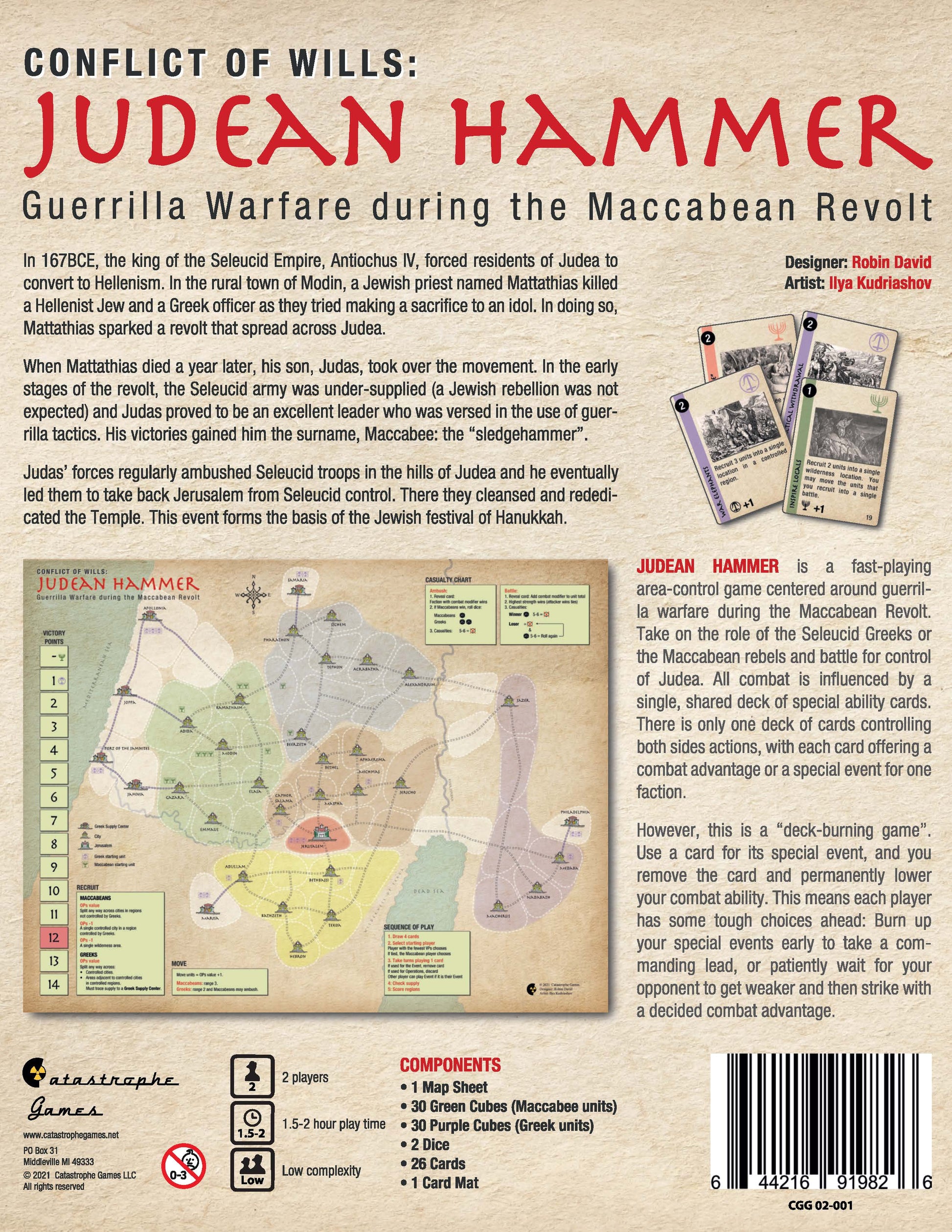 JUDEAN HAMMER is a fast-playing area-control game centered around guerrilla warfare during the Maccabean Revolt. Take on the role of the Seleucid Greeks or the Maccabean rebels and battle for control of Judea. All combat is influenced by a . single, shared deck of special ability cards. There is only one deck of cards controlling both sides actions, with each card offering a combat advantage or a special event for one faction.