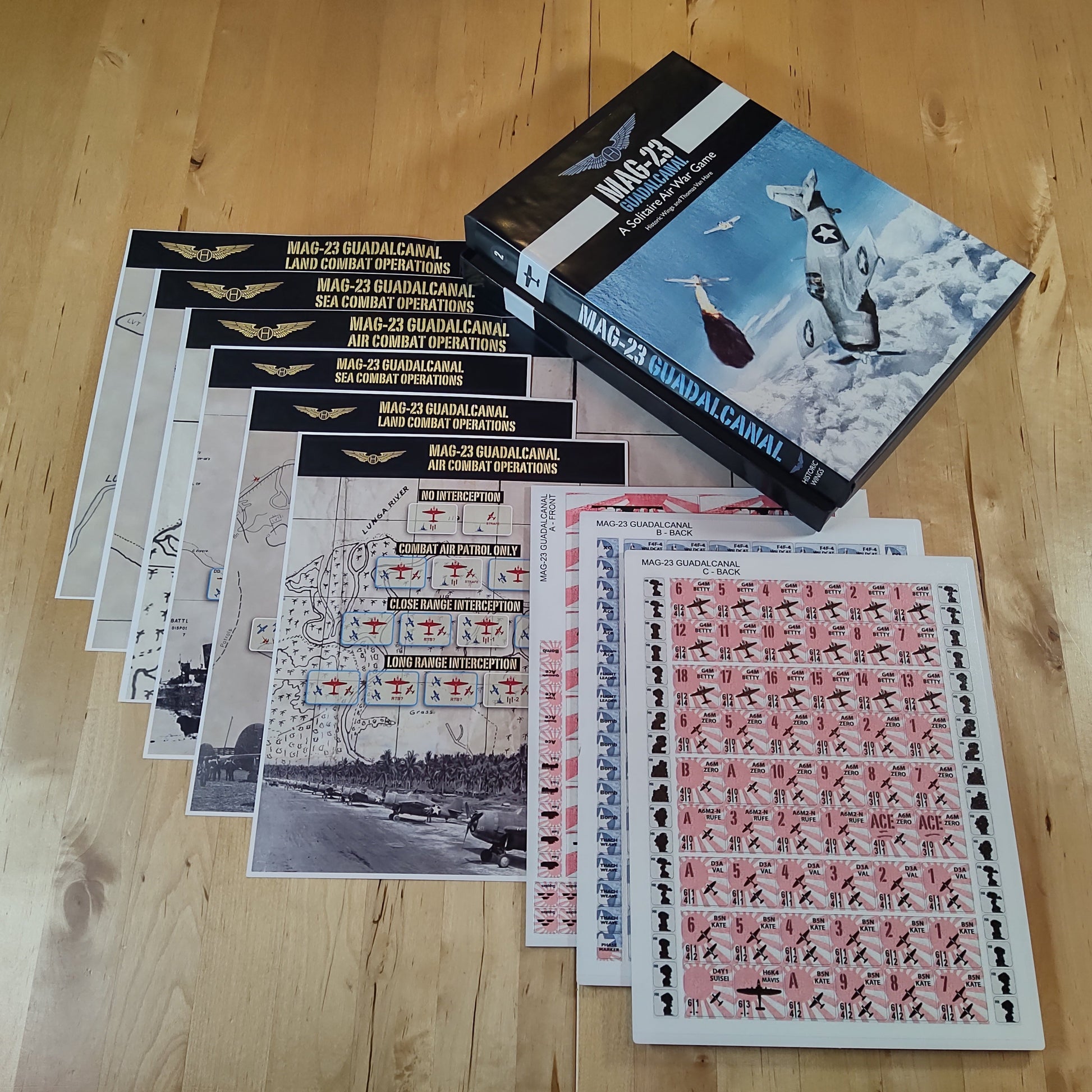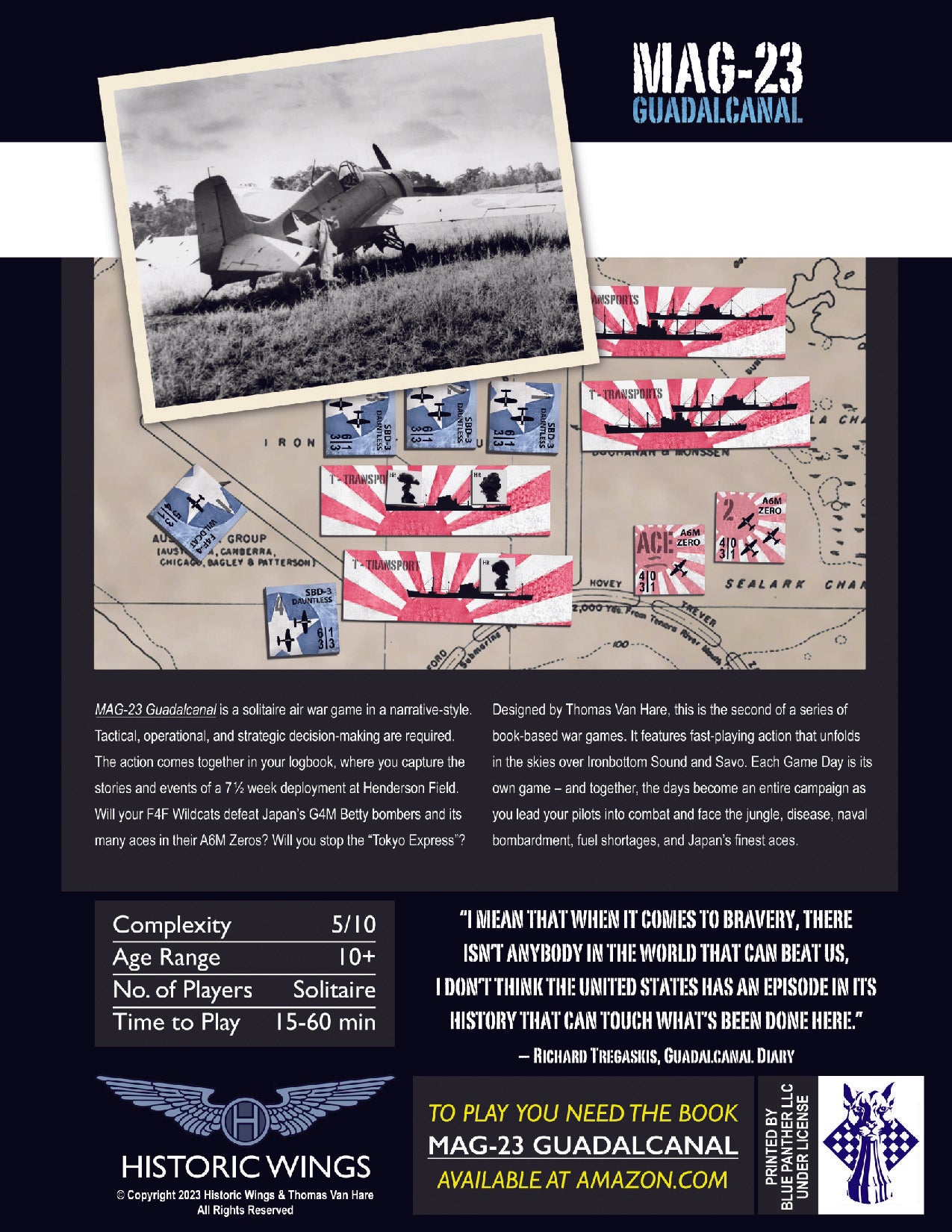 Designed by Thomas Van Hare, MAG-23 is the second in a series of wargame books from Historic Wings. It features fast-playing action that unfolds in the skies over Ironbottom Sound and Savo. Each Game Day is its own game -- and together, the days become an entire campaign as you lead your pilots into combat and face the jungle, disease, naval bombardment, fuel shortages, and Japan's finest aces.