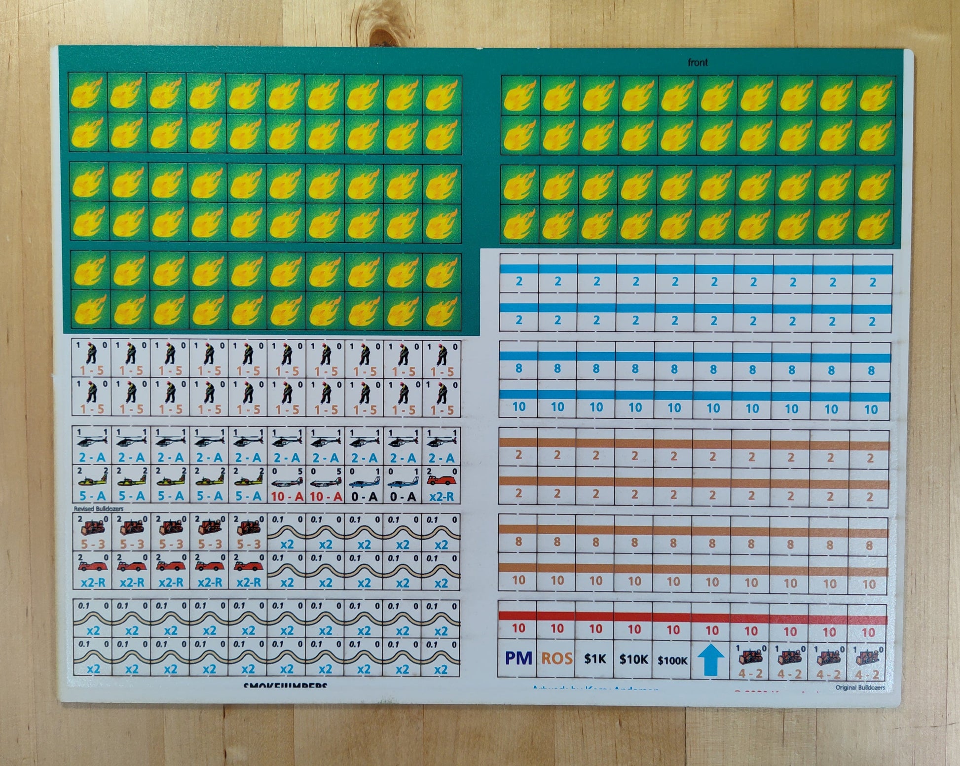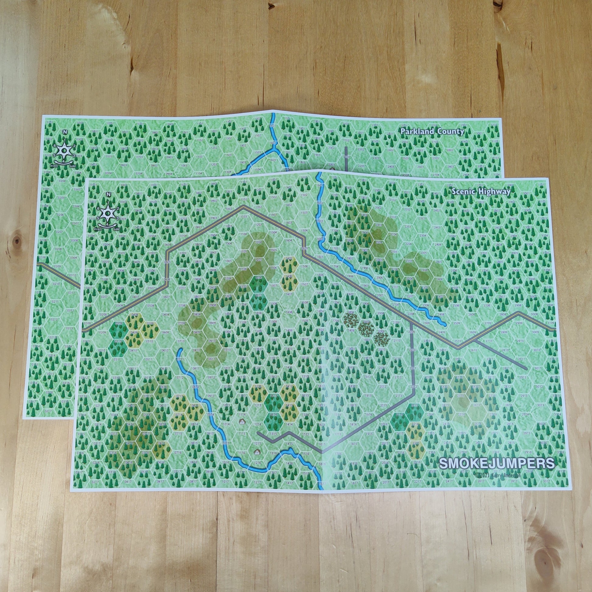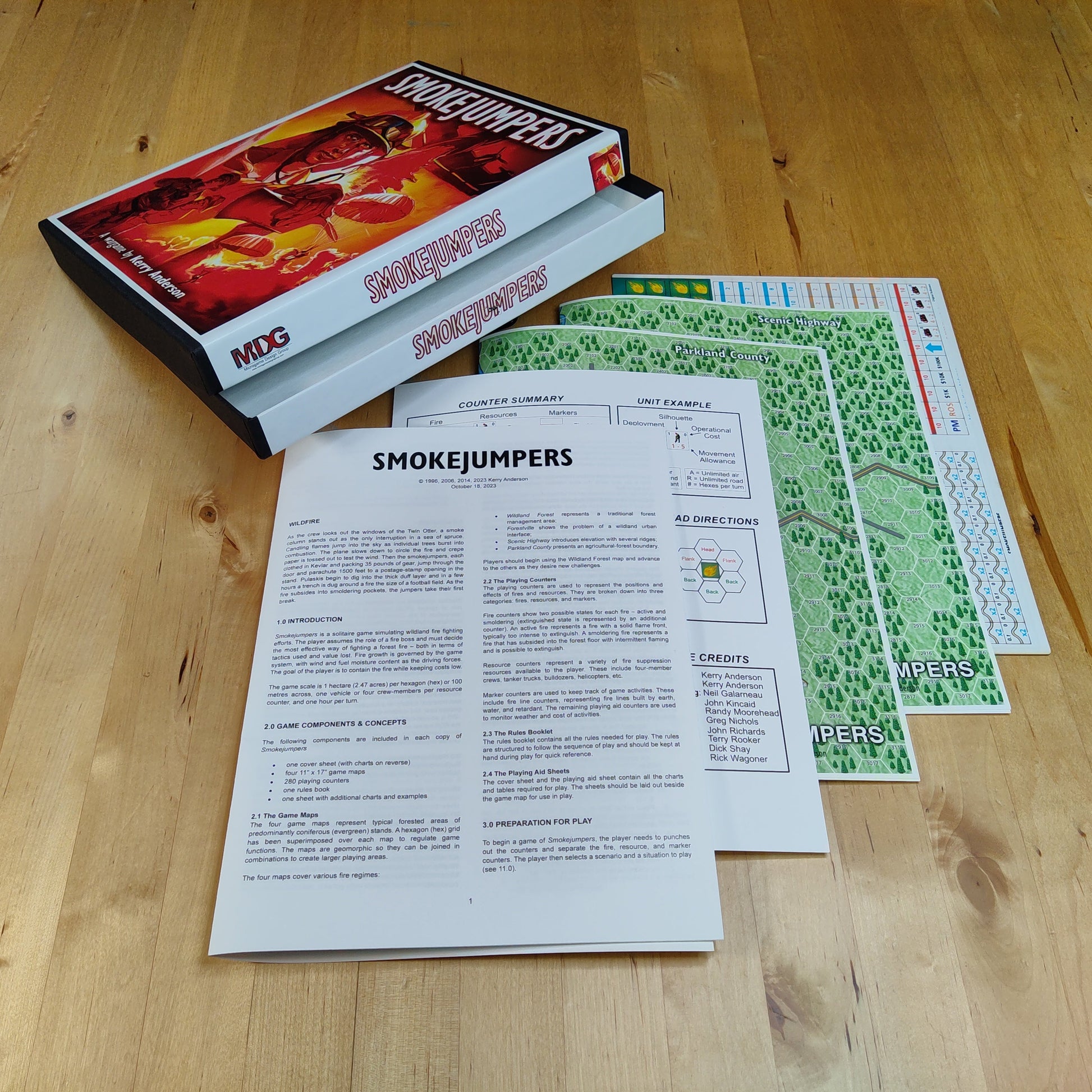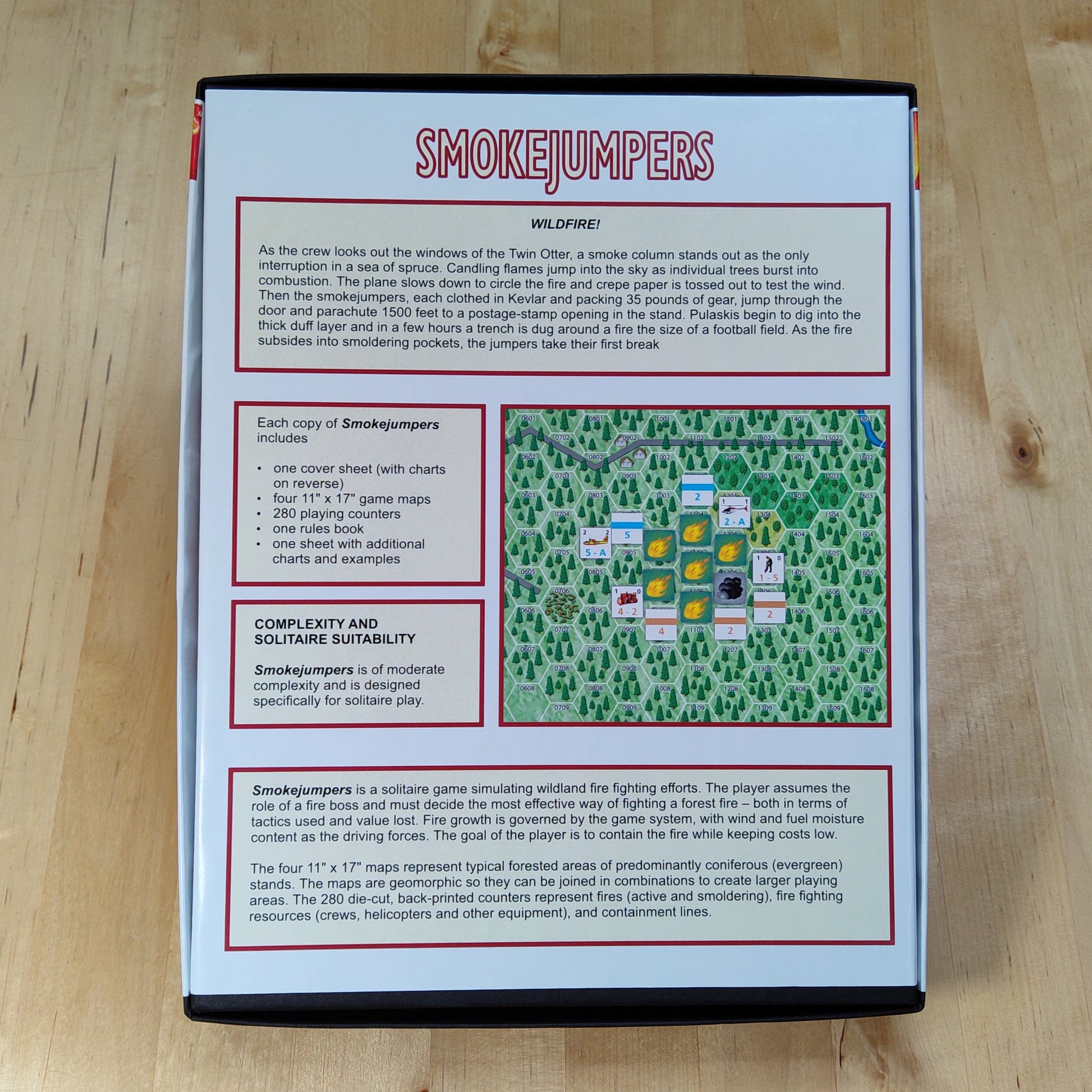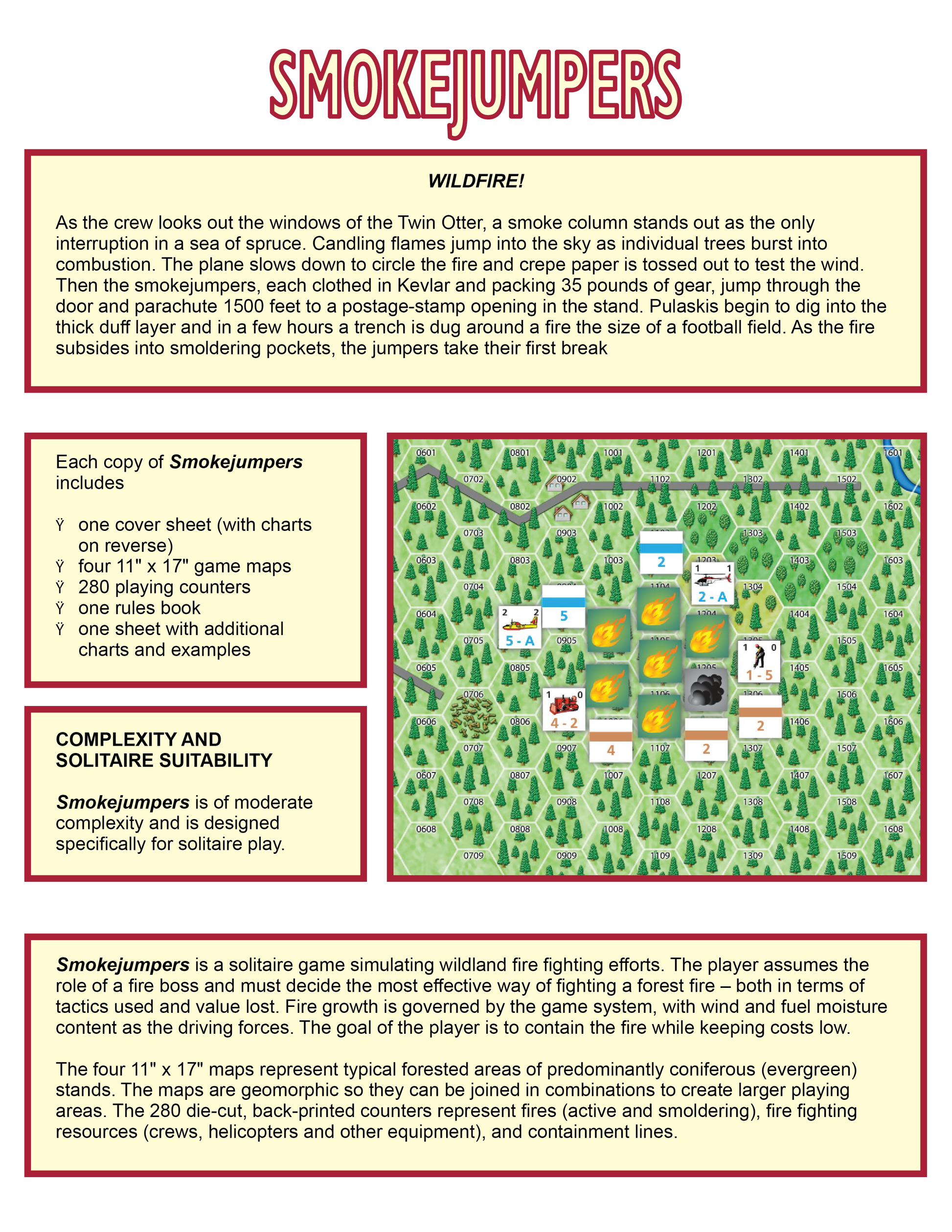The four 11" x 17" inch maps represent typical forested areas of predominantly coniferous (evergreen) stands. The maps are geomorphic so they can be joined in combinations to create larger playing areas. The 280 die-cut, back printed counters to represent fires (active and smoldering), fire fighting resources (crews, helicopters, and other equipment), and containment lines.