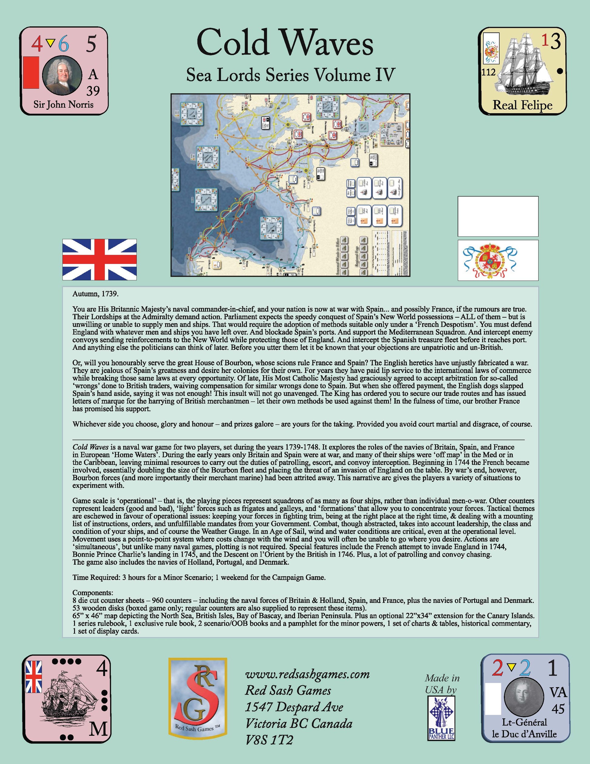 Cold Waves is a naval war game for two players, set during the years 1739-1748. It explores the roles of the navies of Britain, Spain, and France in the European "Home Waters." During the early years, only Britain and Spain were at war, and many of their ships were "off map" in the Med or in the Caribbean, leaving minimal resources to carry out the duties of patrolling, escort, and convoy interception.