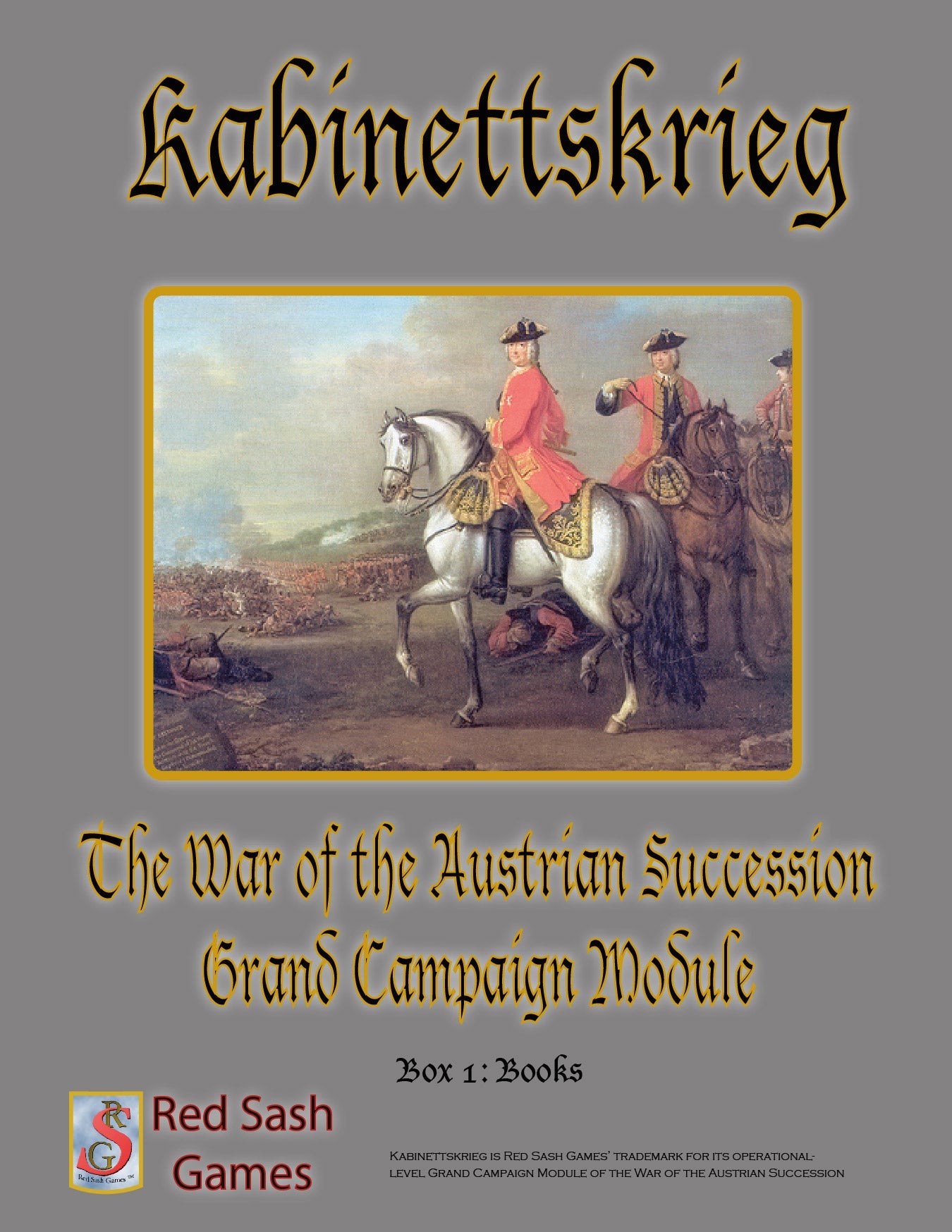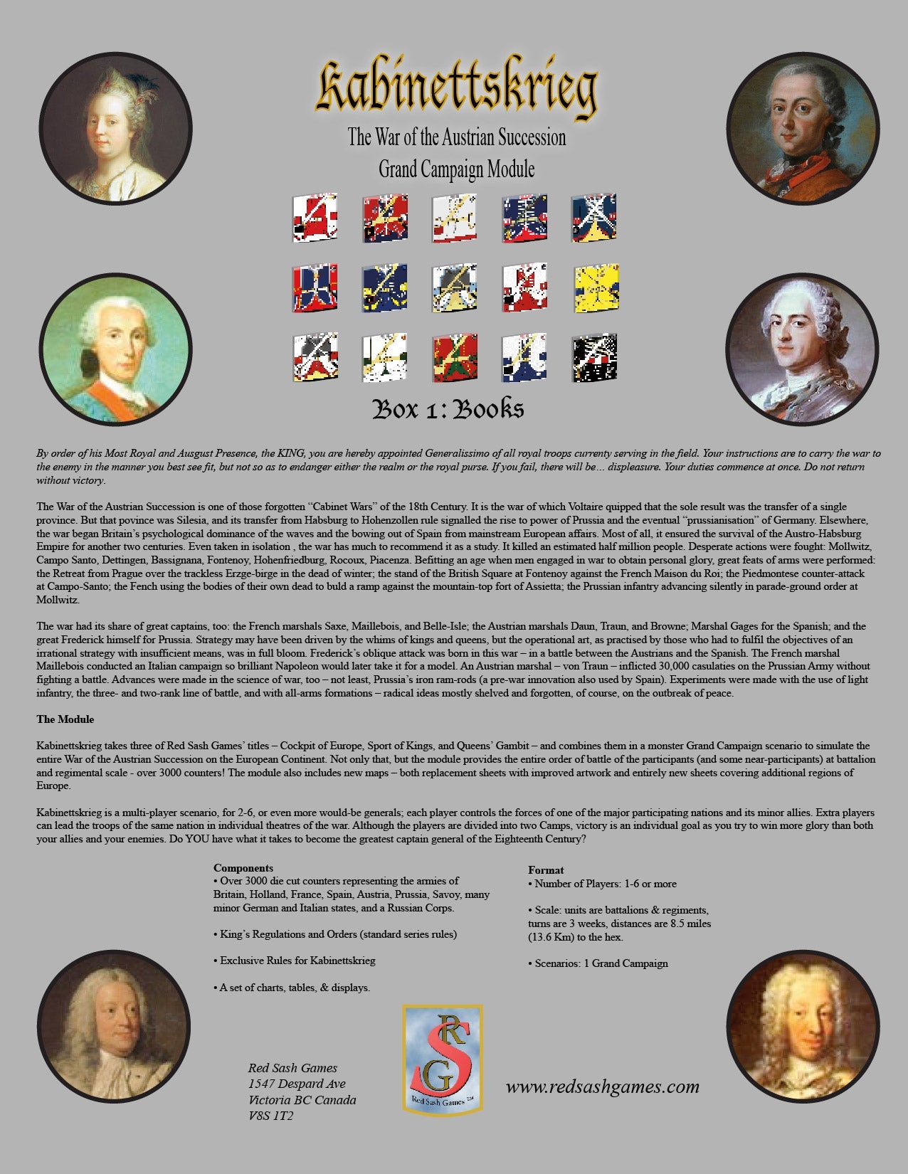 Kabinettskrieg takes three of Red Sash Games’ titles – Cockpit of Europe, Sport of Kings, and Queens’ Gambit – and combines them in a monster Grand Campaign scenario to simulate the entire War of the Austrian Succession on the European Continent. Not only that, but the module provides the entire order of battle of the participants (and some near-participants) at battalion and regimental scale - over 3000 counters! The module also includes new maps – both replacement sheets with improved artwork and entirely new sheets covering additional regions of