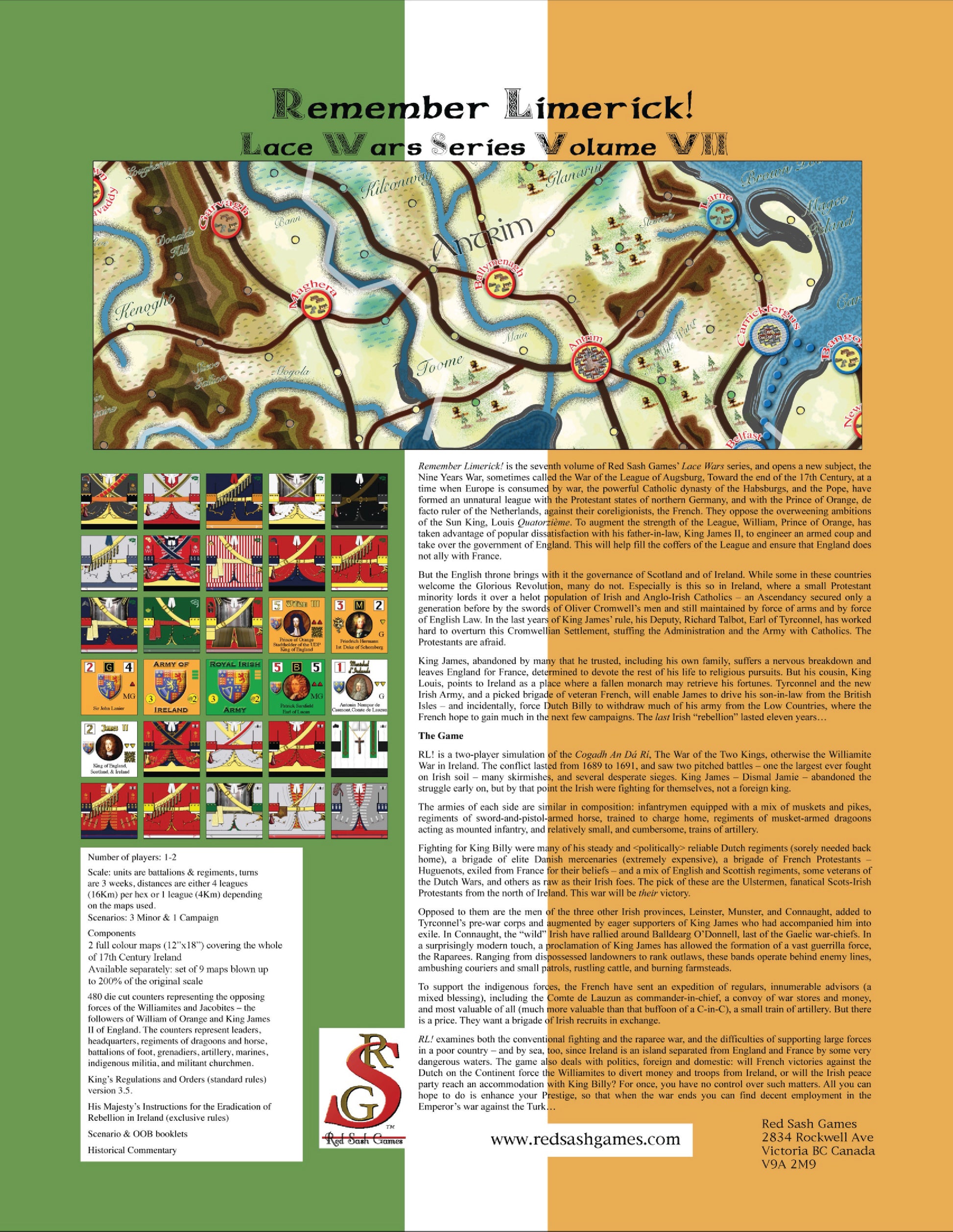 The game examines both the conventional fighting and the "raparee" war, and the difficulties of supporting large forces in a poor country - and by sea, too, since Ireland is an island separated from England and France by some very dangerous waters. The game also deals with politics, foreign and domestic: will French victories against the Dutch on the Continent force the Williamites to divert money and troops from Ireland, or will the Irish peace party reach an accommodation with King Billy?