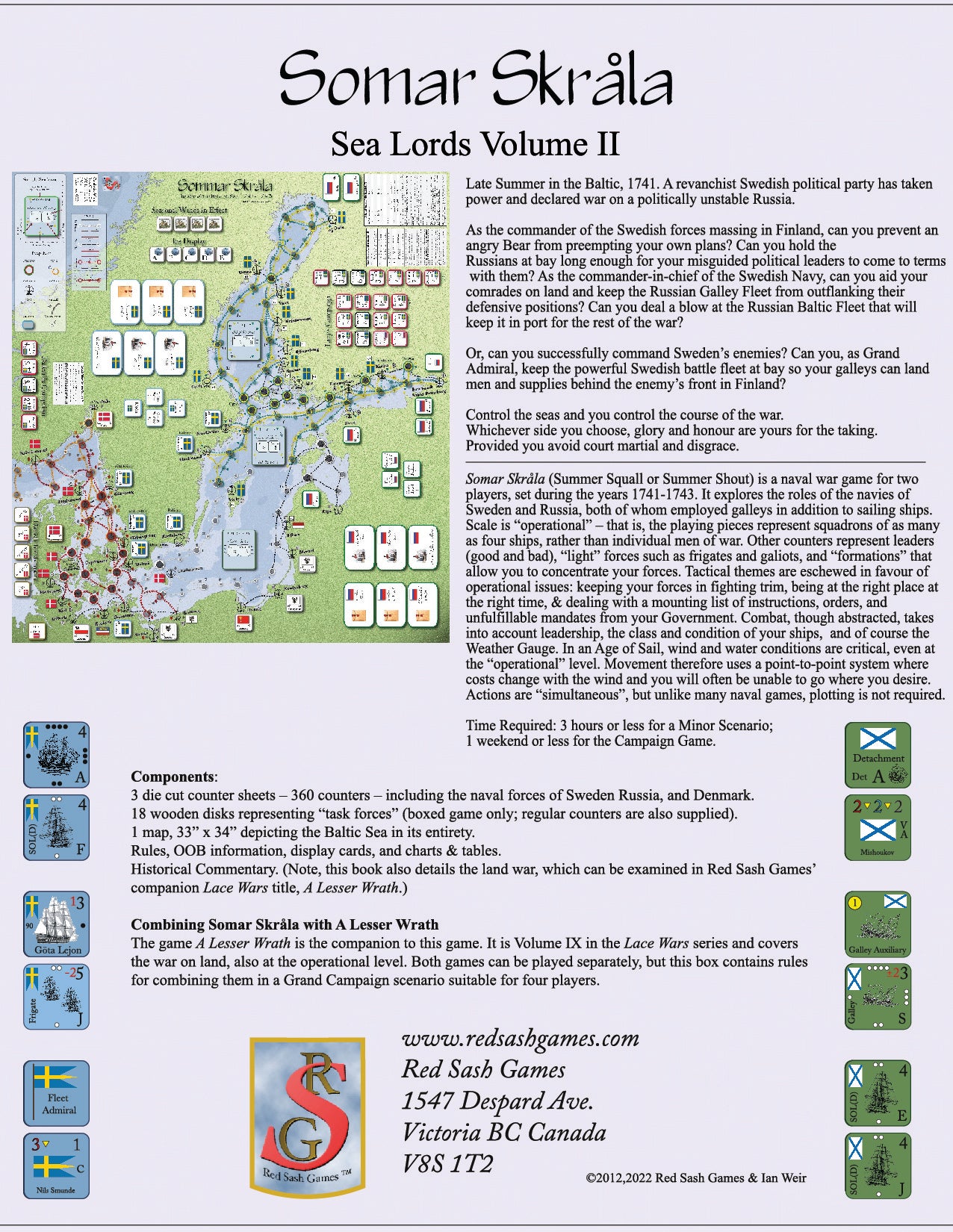 Somar Skrala (Summer Squall or Summer Shout) is a naval war game for two players set during the years 1741-1743. It explores the roles of the navies of Sweden and Russia, both of whom employed galleys in addition to sailing ships. Scale is "operational" -- that is, the playing pieces represent squadrons of as many as four ships, rather than individual men of war.