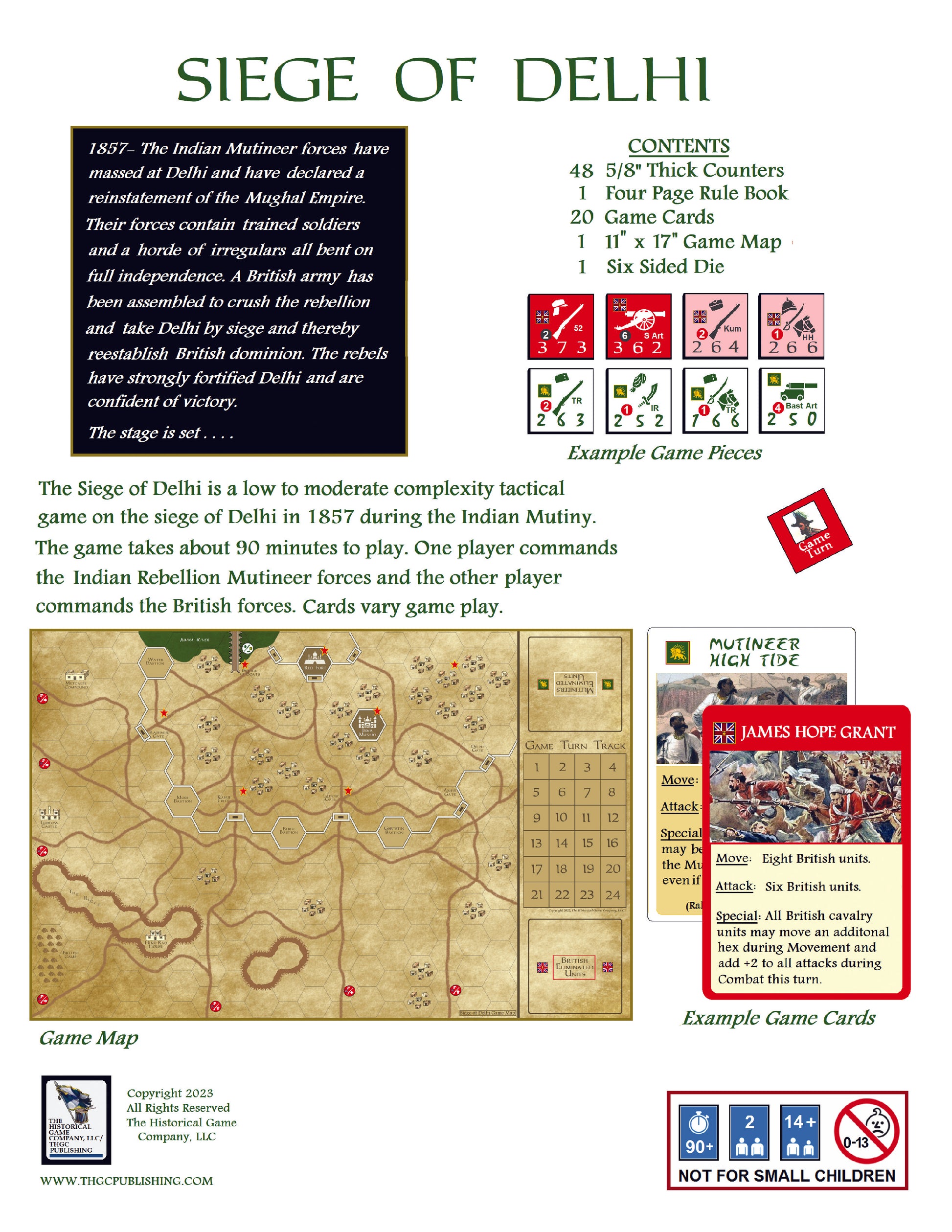 The game takes about 90 minutes to play. One player commands the Indian Mutineer forces and the other player commands the British forces. Cards vary the game play.