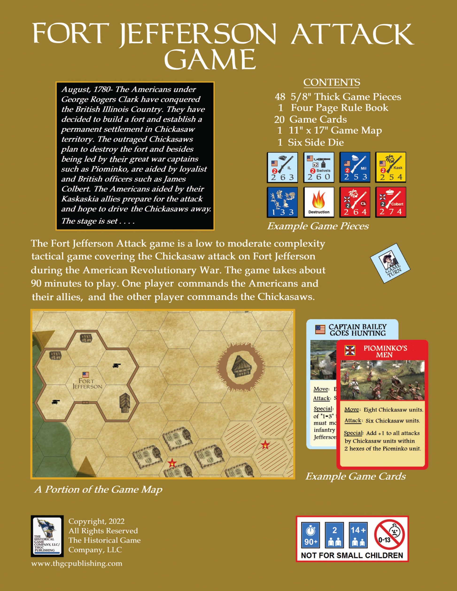 "Fort Jefferson Attack" game is a low-to-moderate complexity tactical game covering the Chickasaw attack on Fort Jefferson during the American Revolutionary War. The game takes about 90 minutes to play. One player commands the Americans and their allies, and the other player commands the Chickasaws.