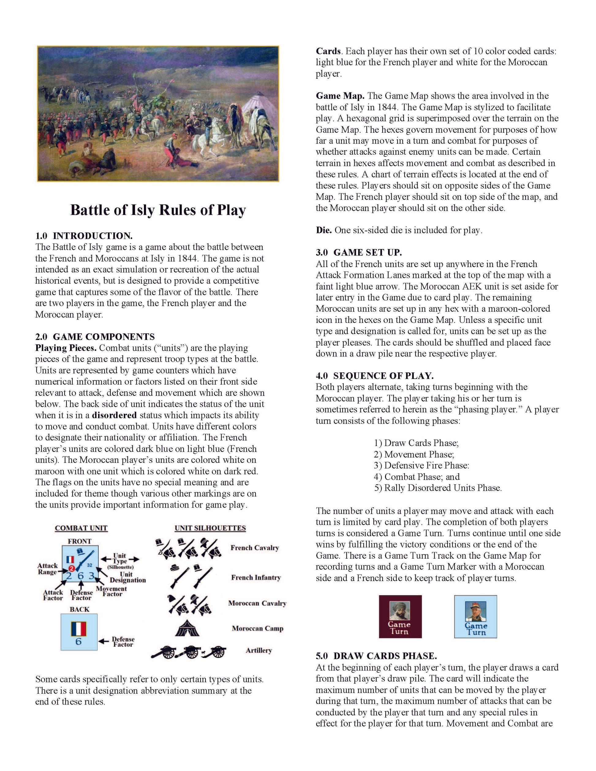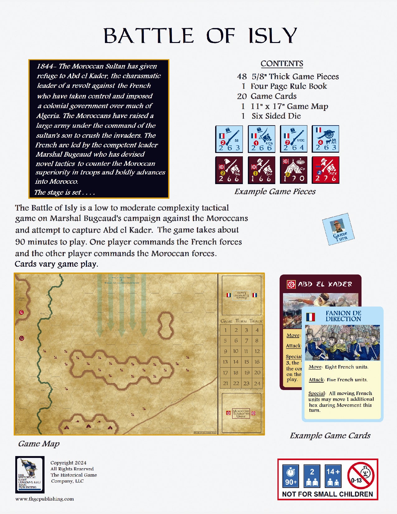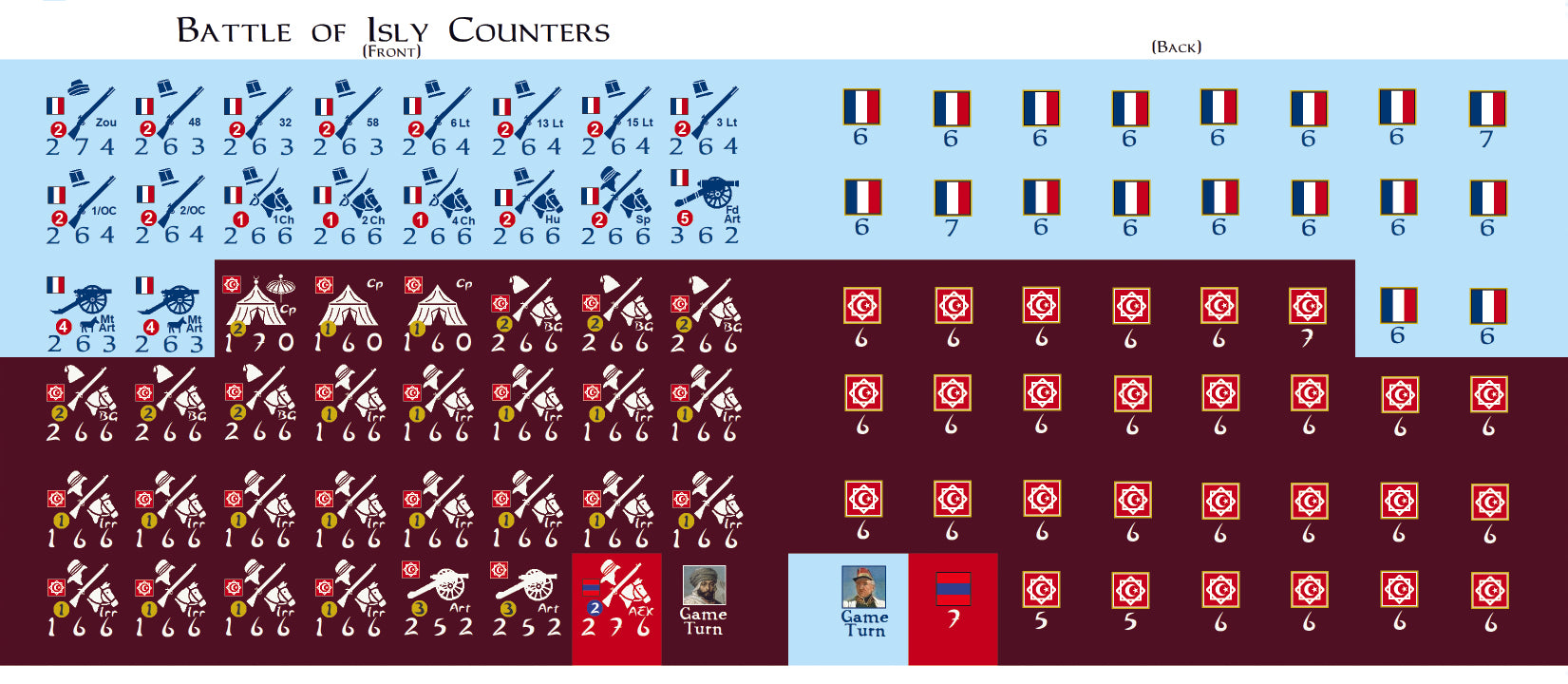 The Battle of Isly is a low to moderate complexity tactical game on Marshal Bugeaud's campaign against the Moroccans and attempt to capture Abd el Kader. The game takes about 90 minutes to play. One player commands the French forces and the other player commands the Moroccan forces.