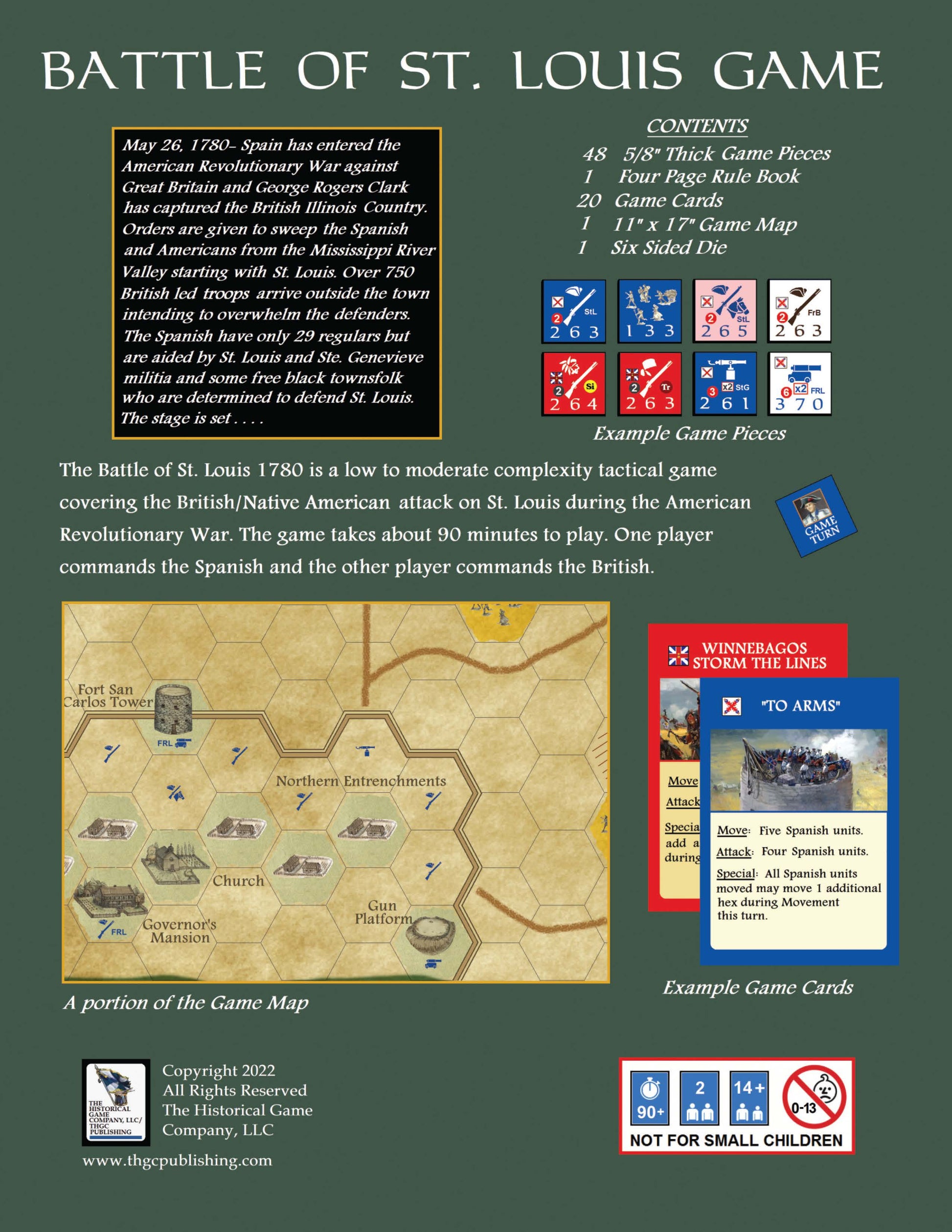 "The Battle of St. Louis: 1780" in a low to moderate complexity tactical game covering the British / Native American attack on St. Louis during the American Revolutionary War. The game takes about 90 minutes to play. One player commands the Spanish and the other player commands the British.