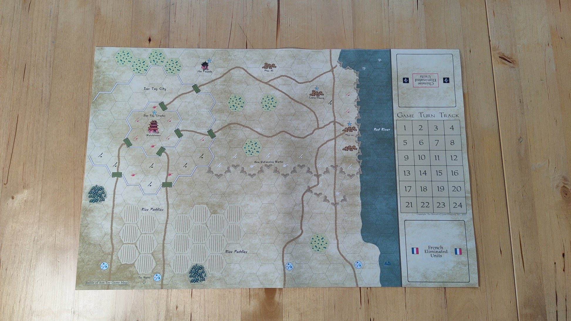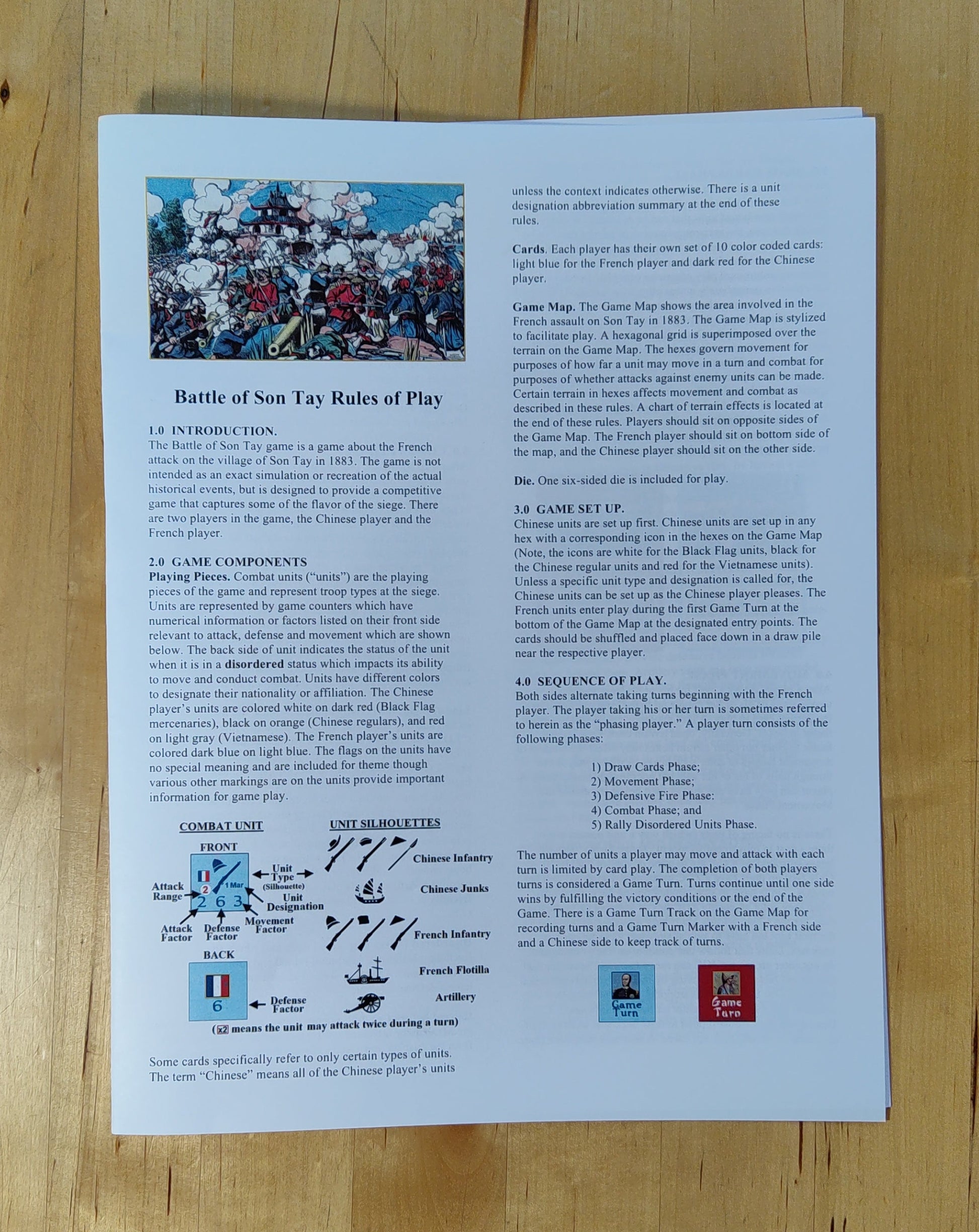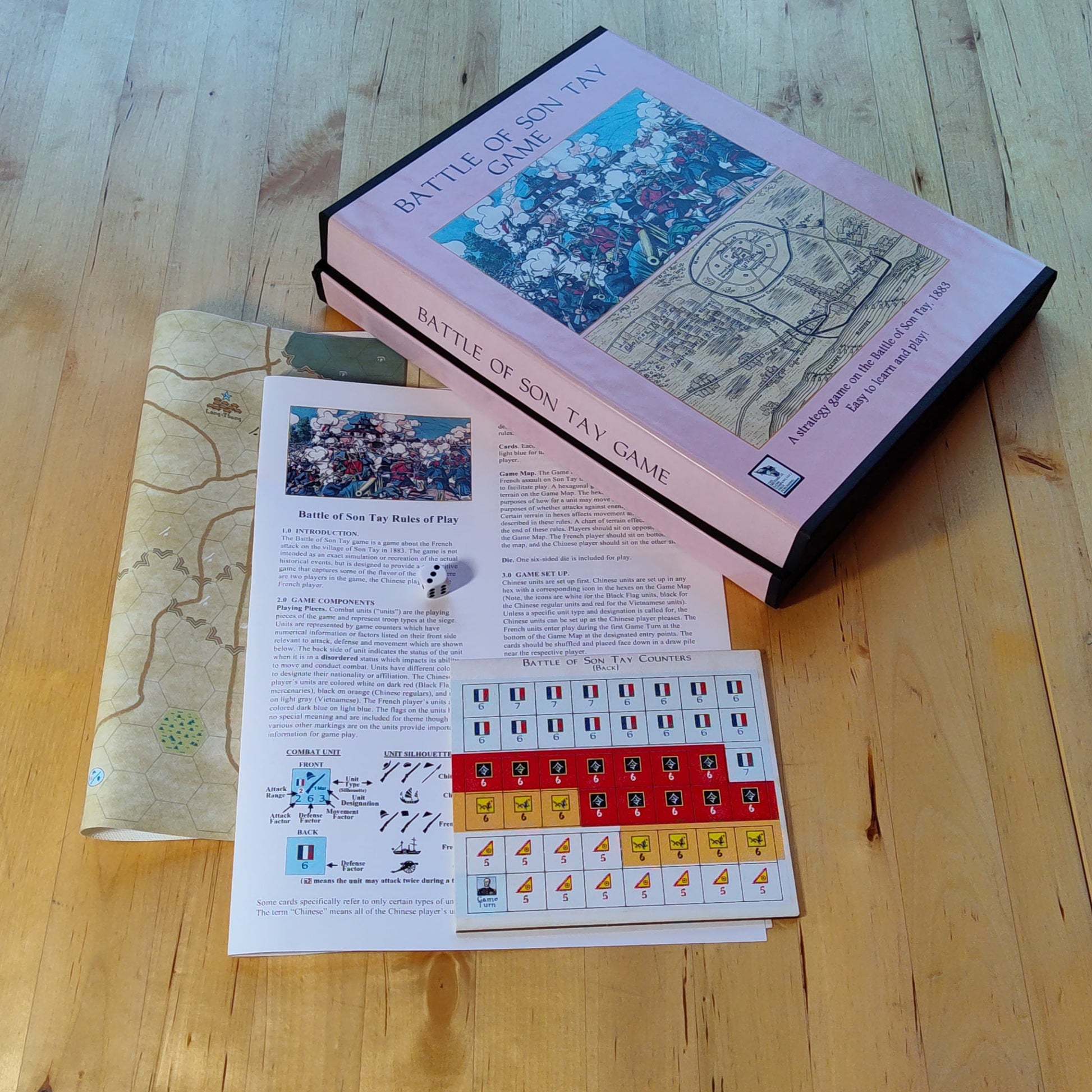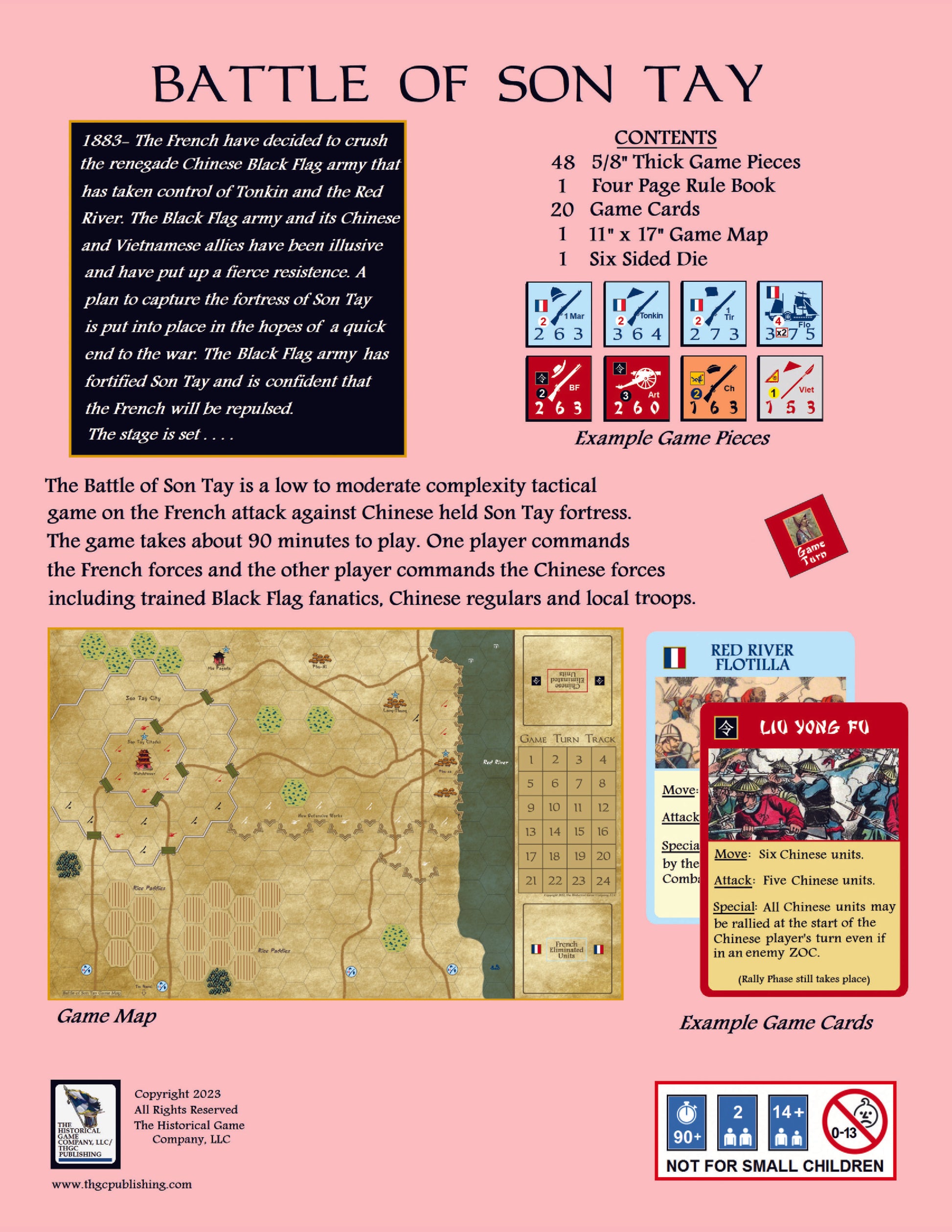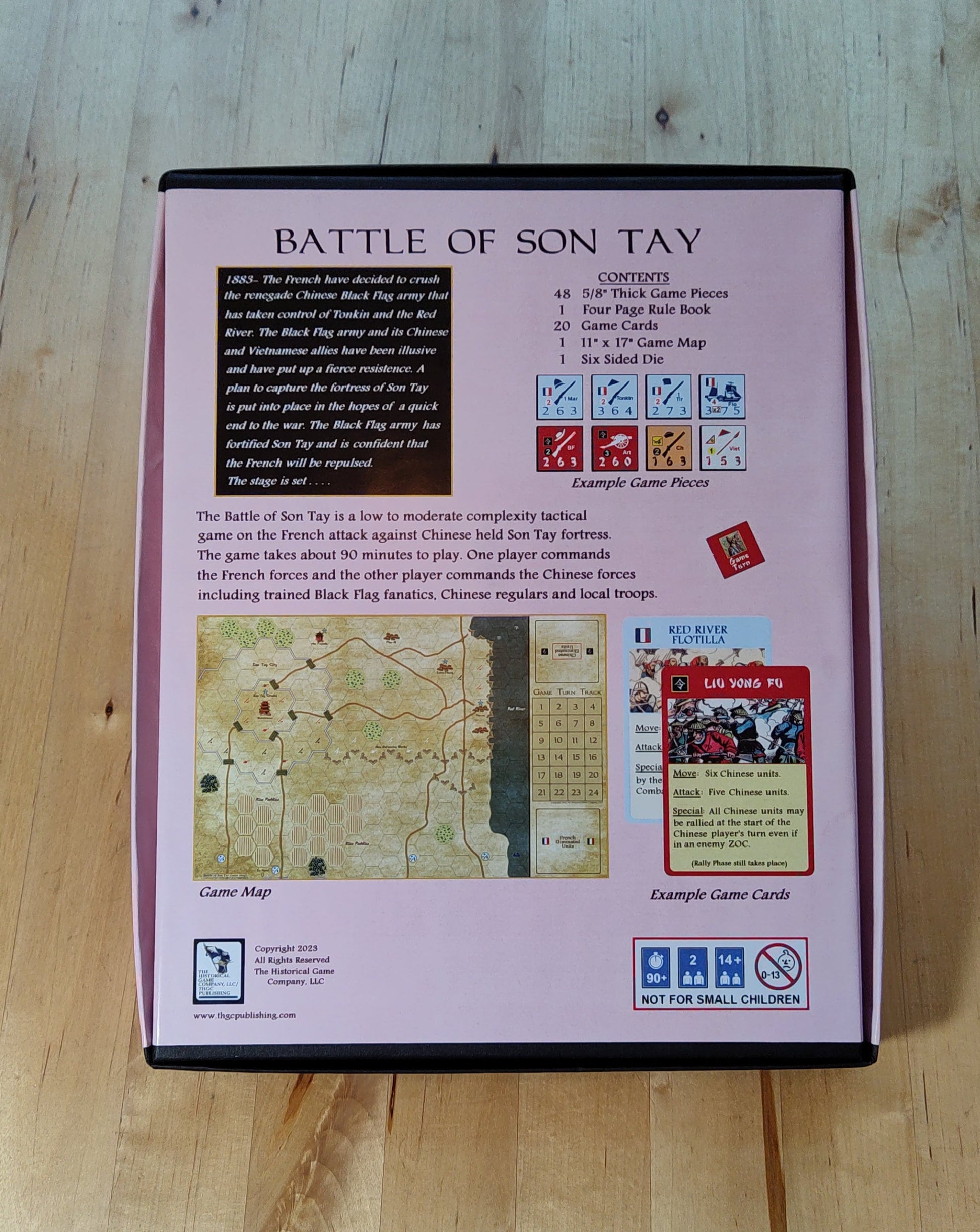 The game takes about 90 minutes to play. One player commands the French forces and the other player commands the Chinese forces. The Chinese side has trained Black Flag fanatics, Chinese regulars, and local troops. Cards vary the game play.