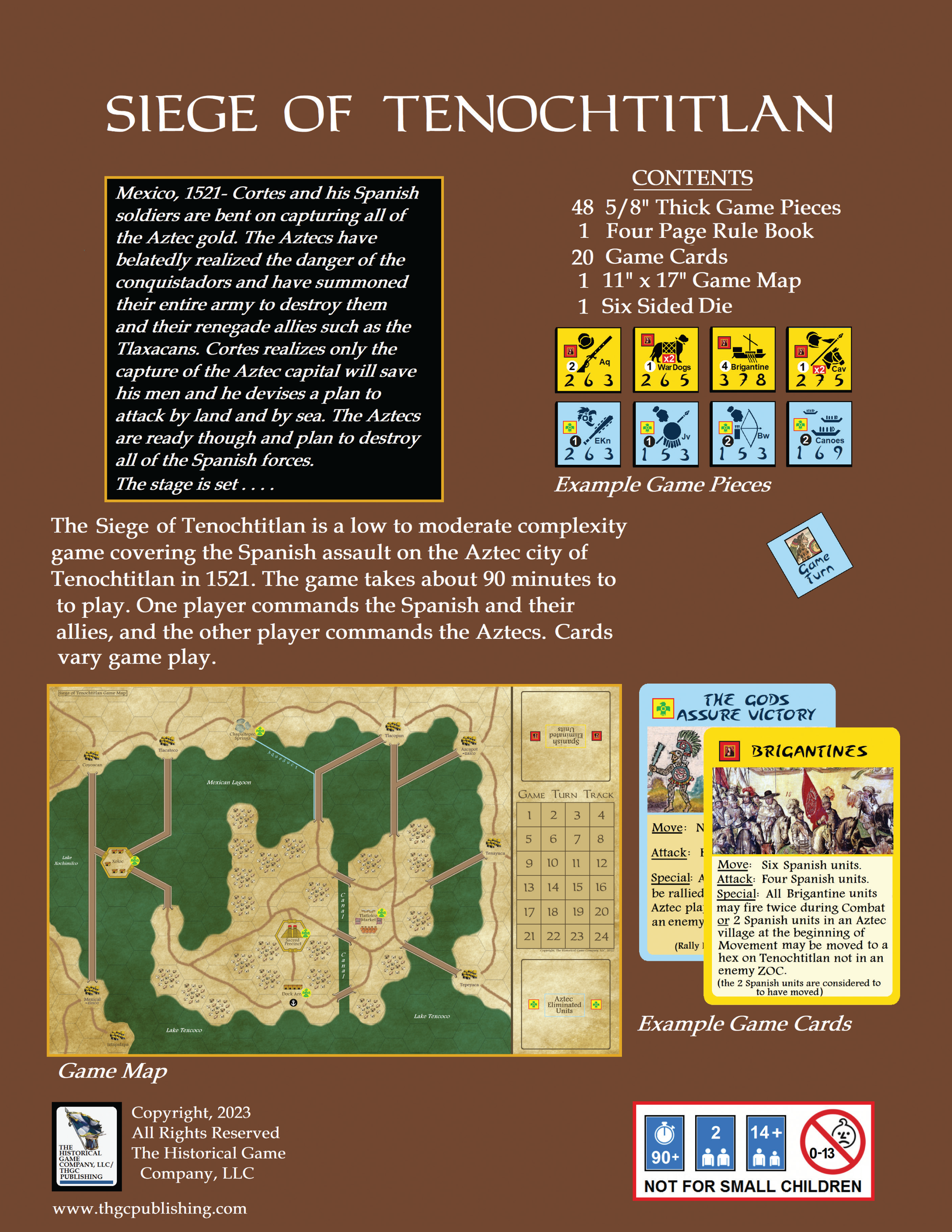 The "Siege of Tenochtitlan" is a low-to-moderate complexity tactical game set during the 16th century. It covers the Spanish assault on the Aztec city of Tenochtitlan in 1521. Which side will prevail? The stage is set...