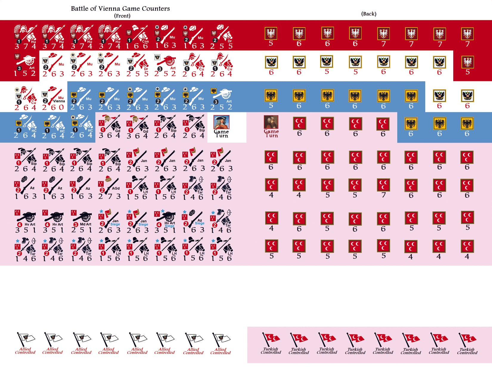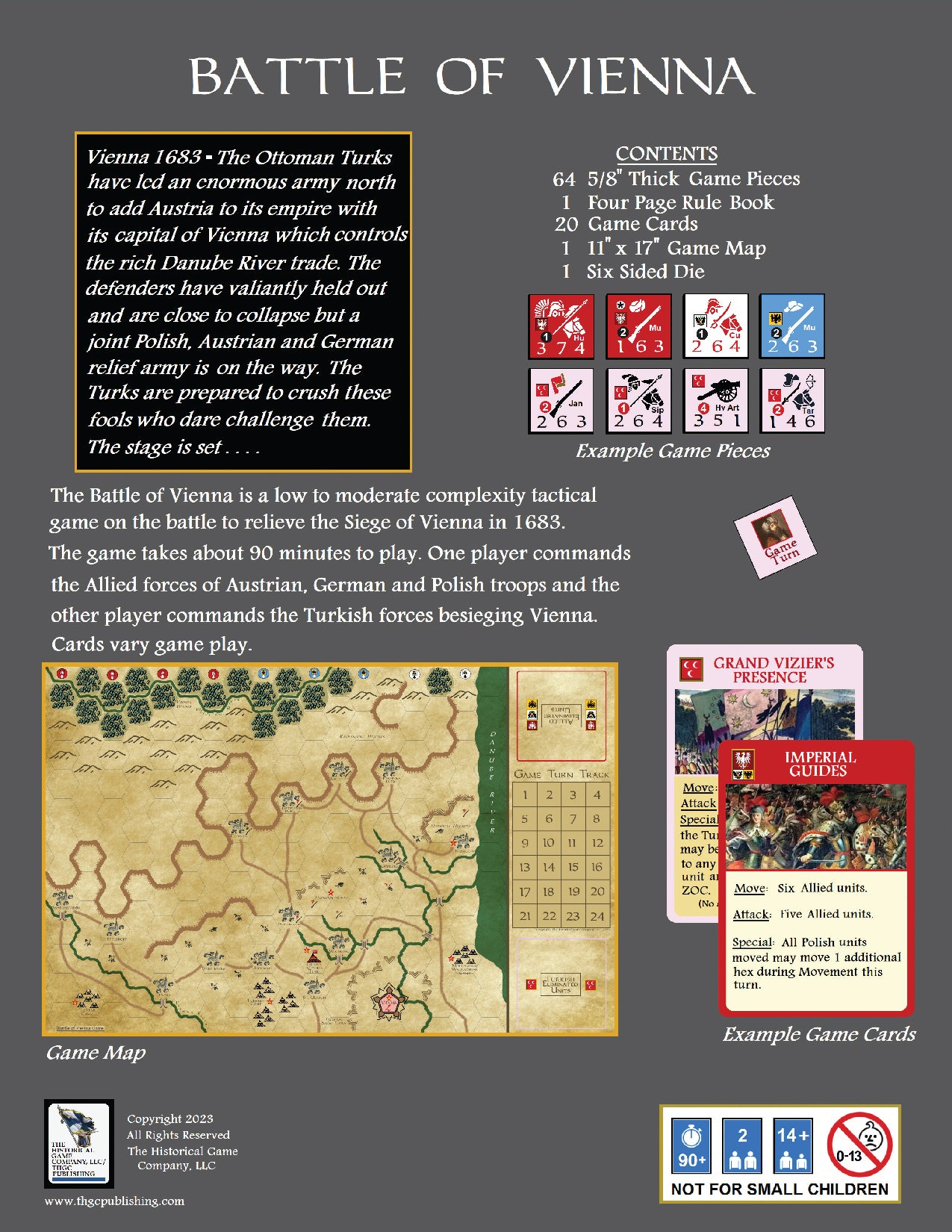 The game takes about 90 minutes to play. One player commands the Allied forces of Austrian, German, and Polish troops, and the other player commands the Turkish forces besieging Vienna. Cards vary game play.